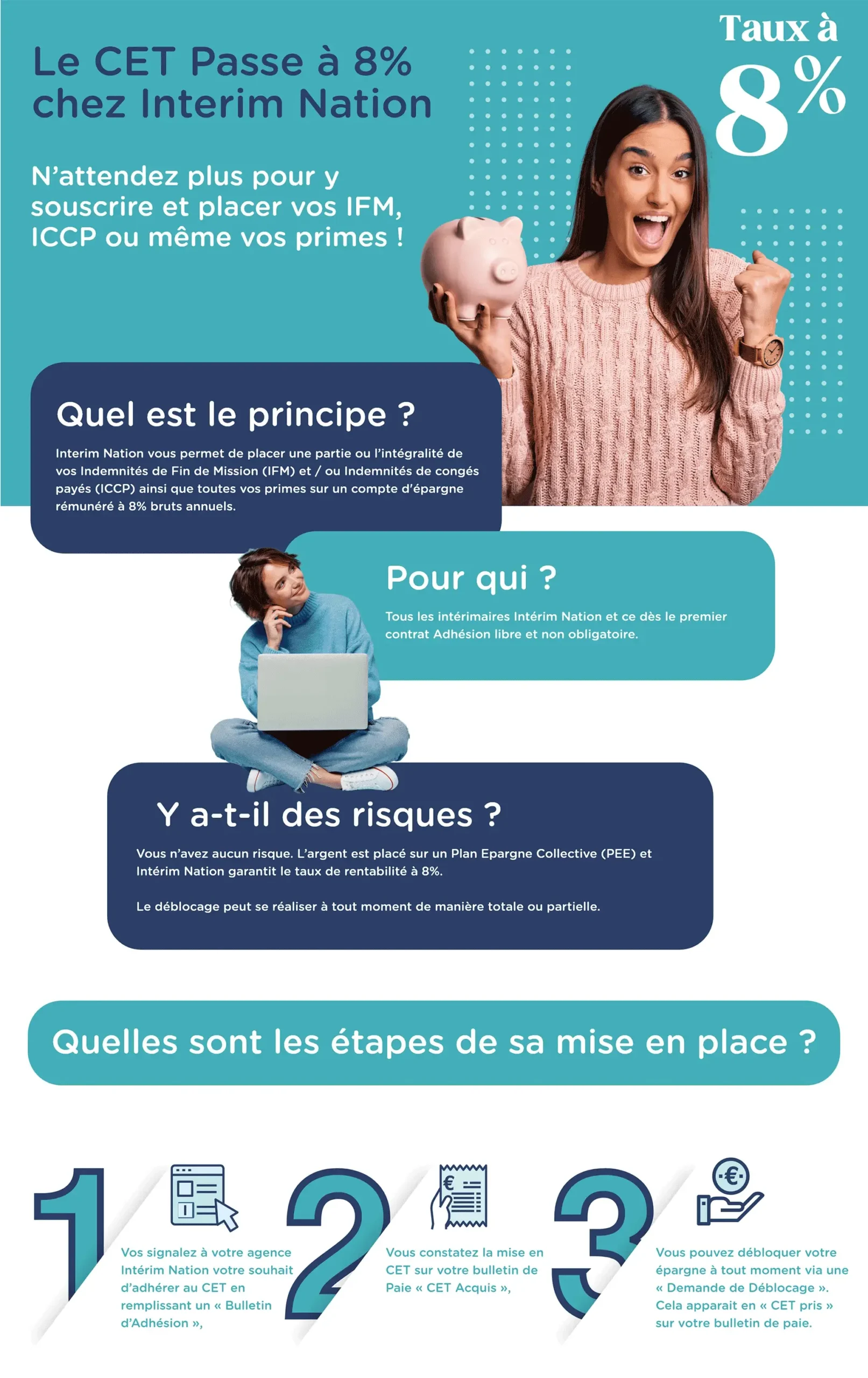 Interim Nation vous offre la possibilité de placer une partie ou l’intégralité de vos Indemnités de Fin de Mission (IFM), Prime 13è Mois, Prime annuelle, Prime de vacances et Gratification anniversaire sur un Compte Epargne Temps (C.E.T.) monétisé en euros et rémunéré à 8% bruts annuels.
